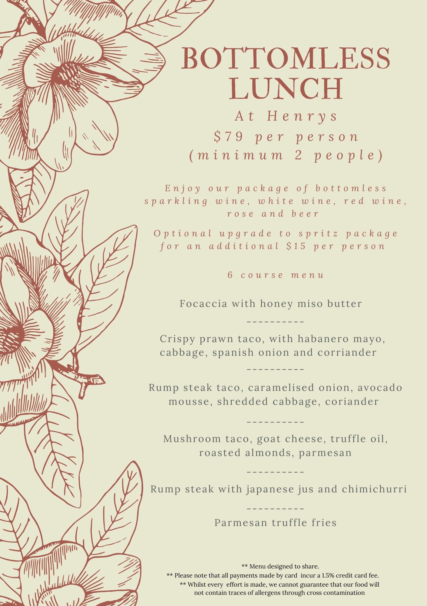 It’s no secret that Sydneysiders love to enjoy bottomless lunch on the weekends. And, that’s why we have created our brilliant boozy bottomless lunch every Friday and Saturday at Henrys. Go bottomless with free flowing Sparkling, Red Wine, White Wine, Rose or Beer. If you’re looking for something more fun and bubbly add on our Spritz Package for $15 PP with your choice of - Aperol Spritz, Elderflower Spritz or Limoncello Spritz.